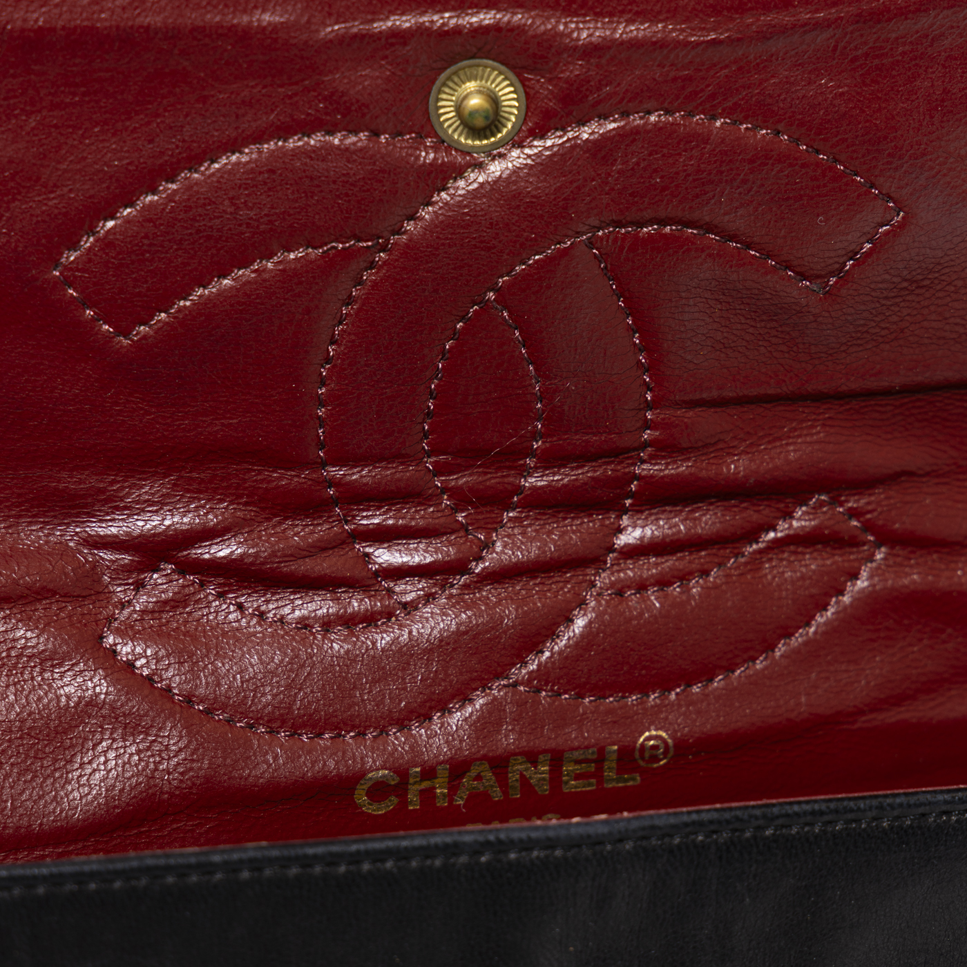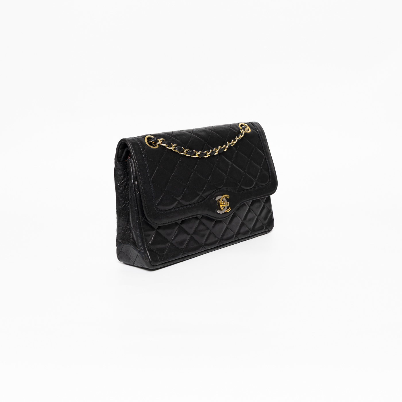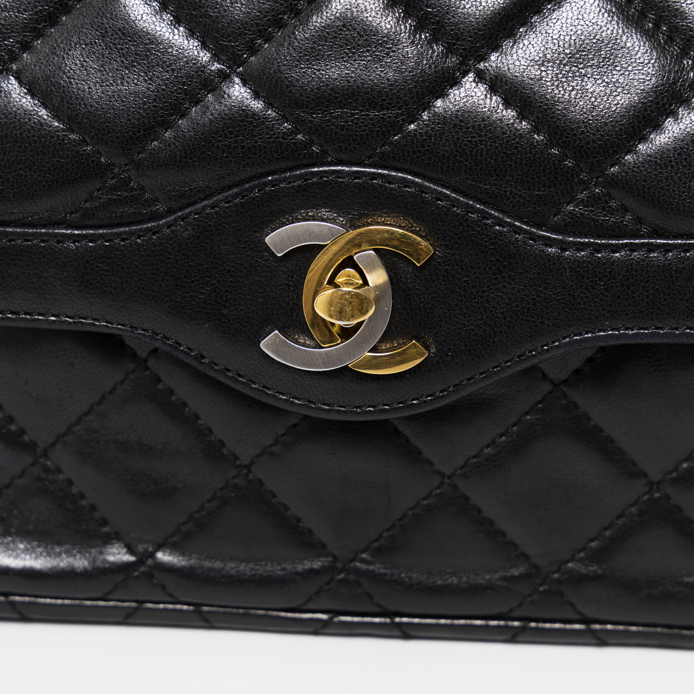 Die Chanel Double Flap Bicolor Tasche aus schwarzem Lambskin überzeugt durch ihre ikonische Eleganz und das klassische Steppmuster mit kontrastierendem CC-Verschluss.