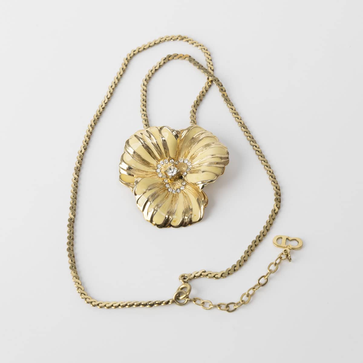 Diese Christian Dior Kette mit Blumen Anhänger ist ein zeitlos elegantes Schmuckstück und die perfekte Ergänzung zu einer eleganten Garderobe. Die Kette sitzt elegant im Rundhalsausschnitt oder wunderbar bei Trägerlosen Kleidern und umspielt elegant den Hals. Die Länge der Kette liegt bei etwa 55cm.