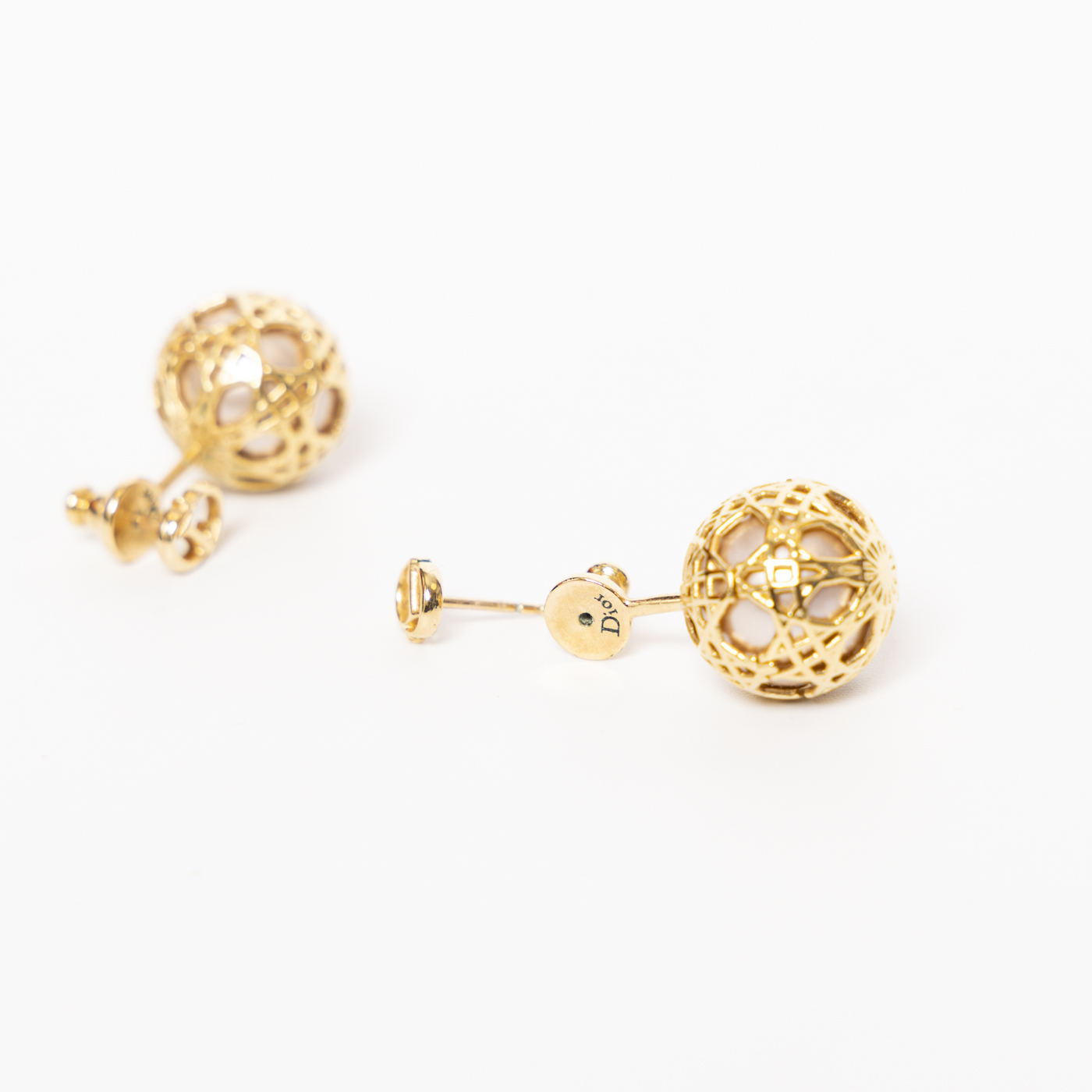 Diese Dior Tribales Ohrringe in filigraner Gitteroptik vereinen klassischen Glamour mit moderner Leichtigkeit. Die vergoldete Struktur umschließt zart schimmernde Perlen und sorgt für ein harmonisches Spiel aus Licht und Textur.