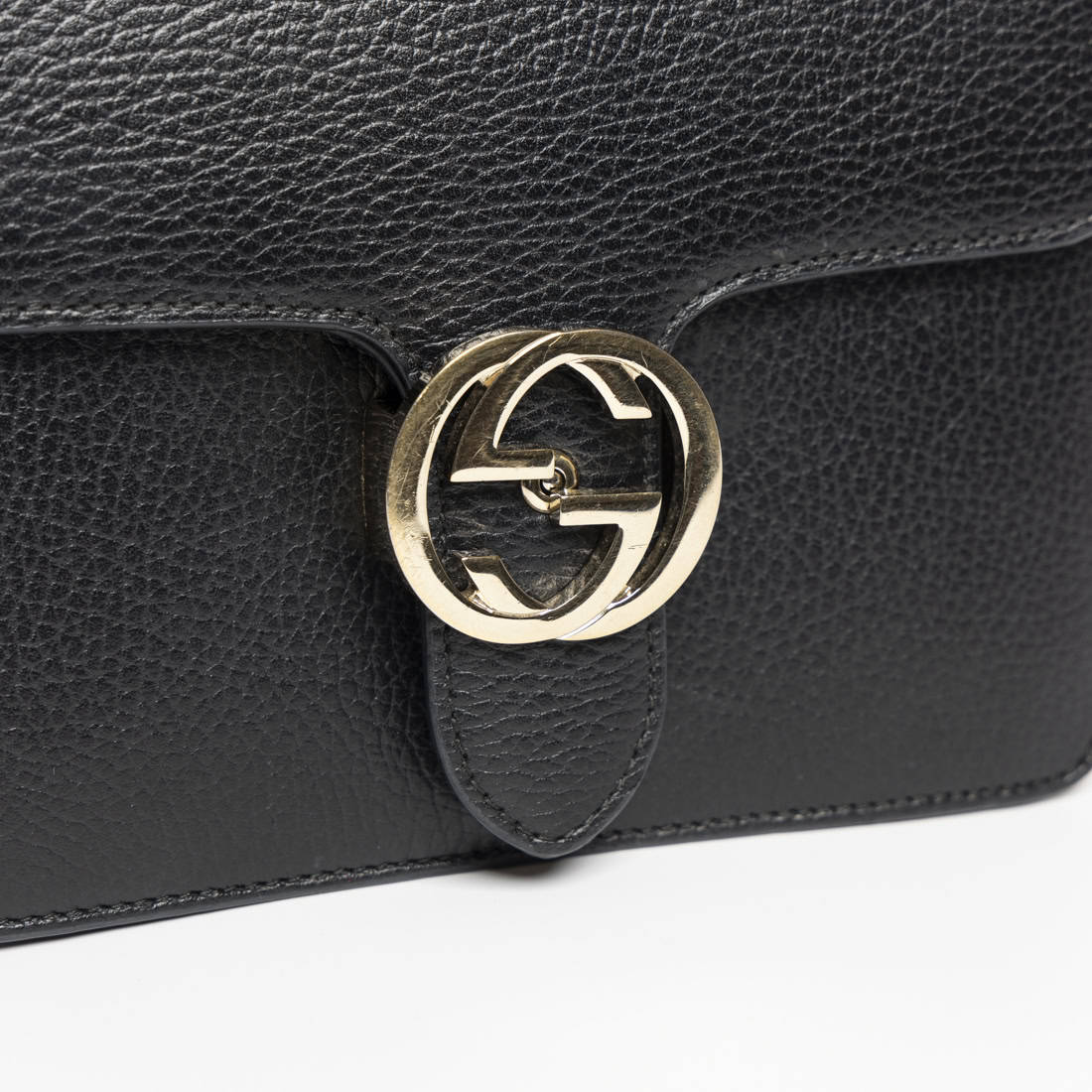 Diese elegante Gucci GG Interlocking Tasche aus schwarzem Leder besticht durch ihr zeitloses Design und die markante GG-Schließe in goldfarbener Hardware. Ein stilvolles Accessoire, das sowohl zu eleganten als auch zu lässigen Looks passt.