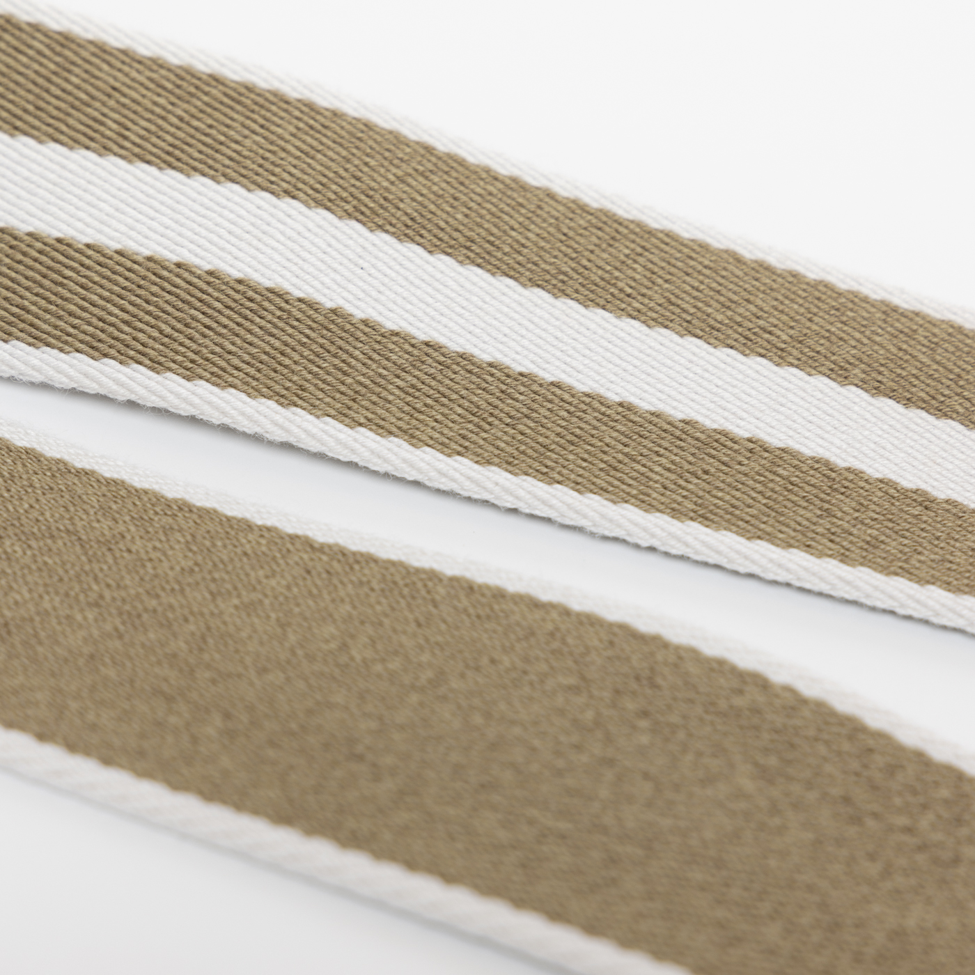 Das zweifarbige Streifenmuster in Beige und Weiß verleiht dem Accessoire eine zeitlos-sportive Note, während die Endstücke aus cognacfarbenem Leder und die palladiumfarbene Hardware für den typischen Hermès-Luxus sorgen. Mit einer Länge von 75 cm ist der Riemen ideal als kurzer Schultergurt für kleinere Taschen.