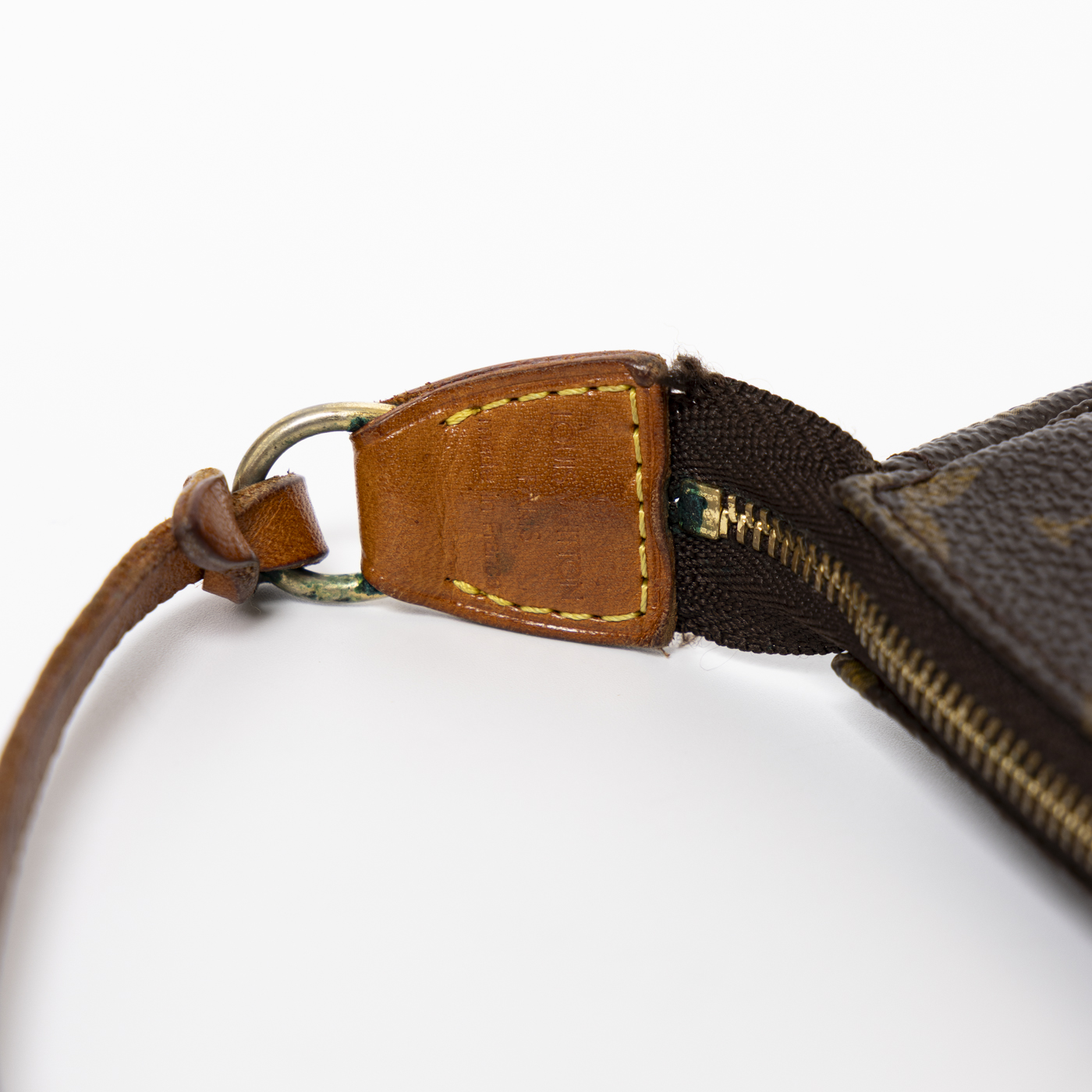 Gefertigt aus beschichtetem Monogram Canvas mit naturfarbenem Lederhenkel und goldfarbener Hardware, eignet sich die Pochette ideal als Schultertasche oder als elegante Clutch. Der Reißverschluss sorgt für eine sichere und zugleich minimalistische Handhabung.