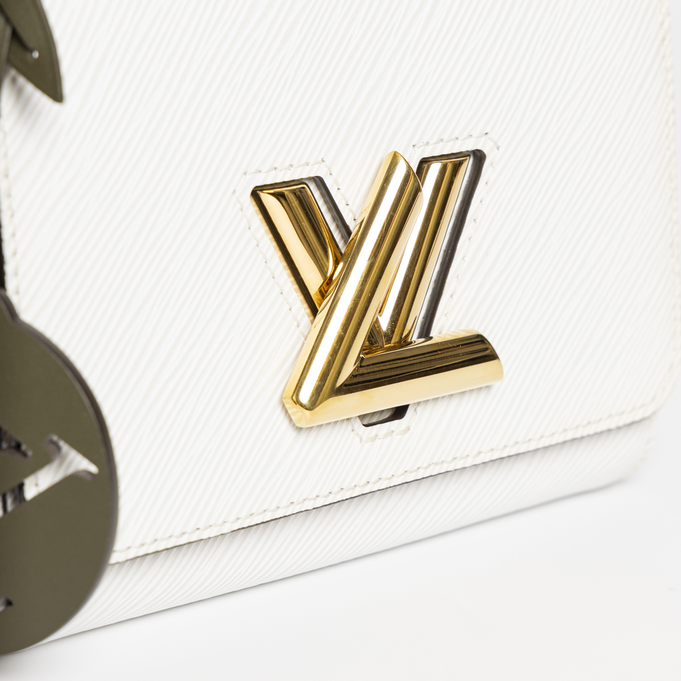 Diese elegante Louis Vuitton Twist MM besticht durch ihre strukturierte Epi-Leder-Ausführung in Weiß und die markante goldfarbene LV-Drehschließe. Der abnehmbare Schulterriemen in Beige sowie die dekorative Kette und der grüne LV-Anhänger sorgen für einen modernen, wandelbaren Look.