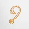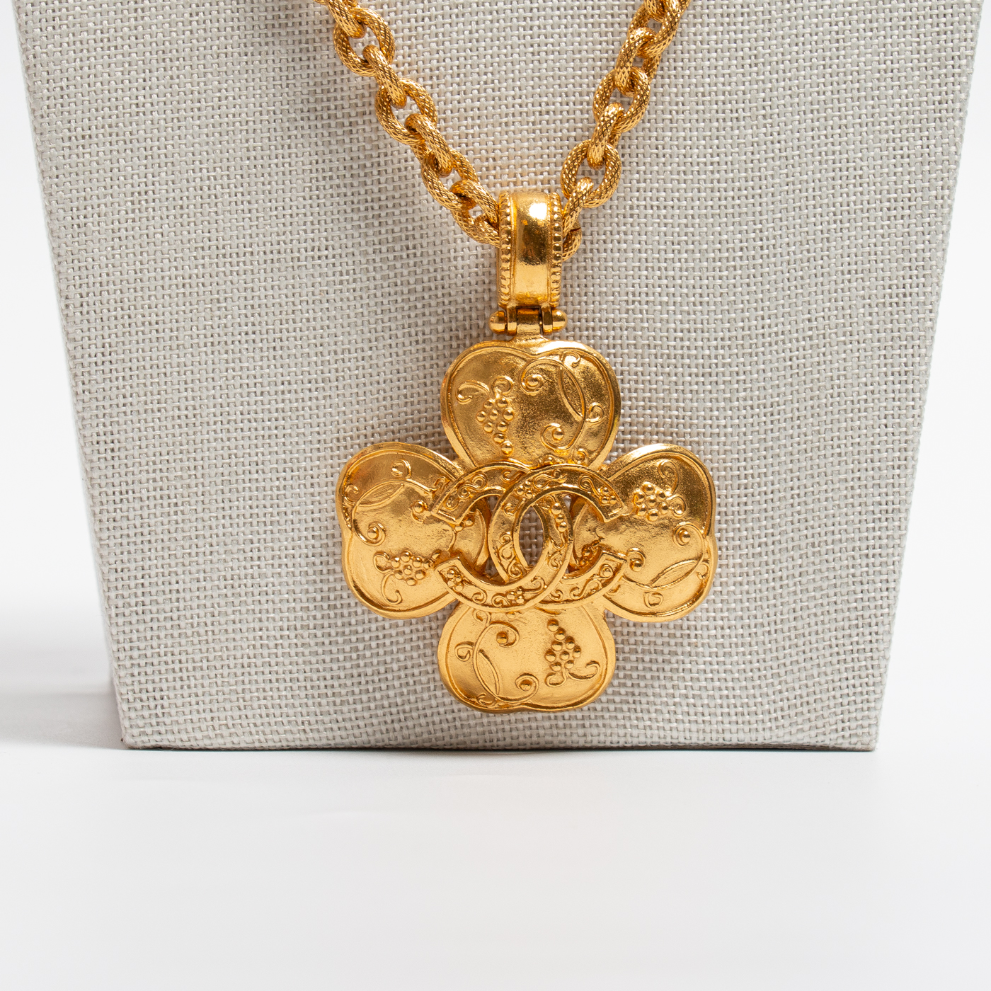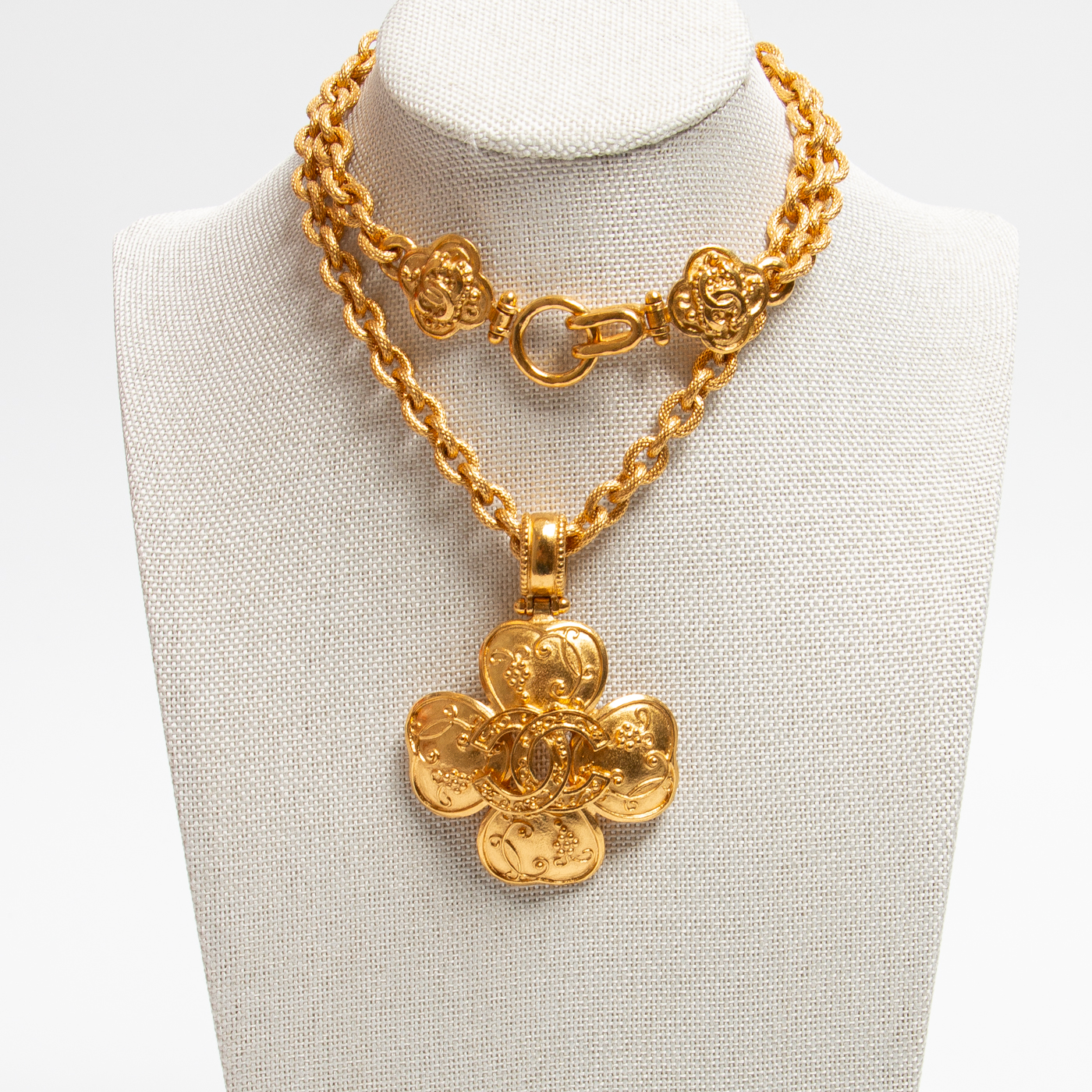Chanel Halskette aus der 1996 A Kollektion mit opulentem Kleeblatt-Anhänger in Goldfarbe, akzentuiert durch das ikonische CC-Logo im Zentrum. Das dekorative Design verbindet florale Elemente mit der unverkennbaren Handschrift der Maison.