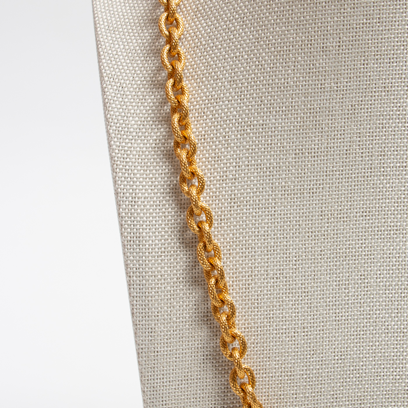 Gefertigt aus vergoldetem Metall, zeigt sich die Kette mit fein gearbeiteter Gliederstruktur und harmonisch integriertem Anhänger. Mit einer Kettenlänge von ca. 60 cm und einem Anhänger von etwa 6,5 × 4,5 cm eignet sich das Schmuckstück ideal als markantes Statement.