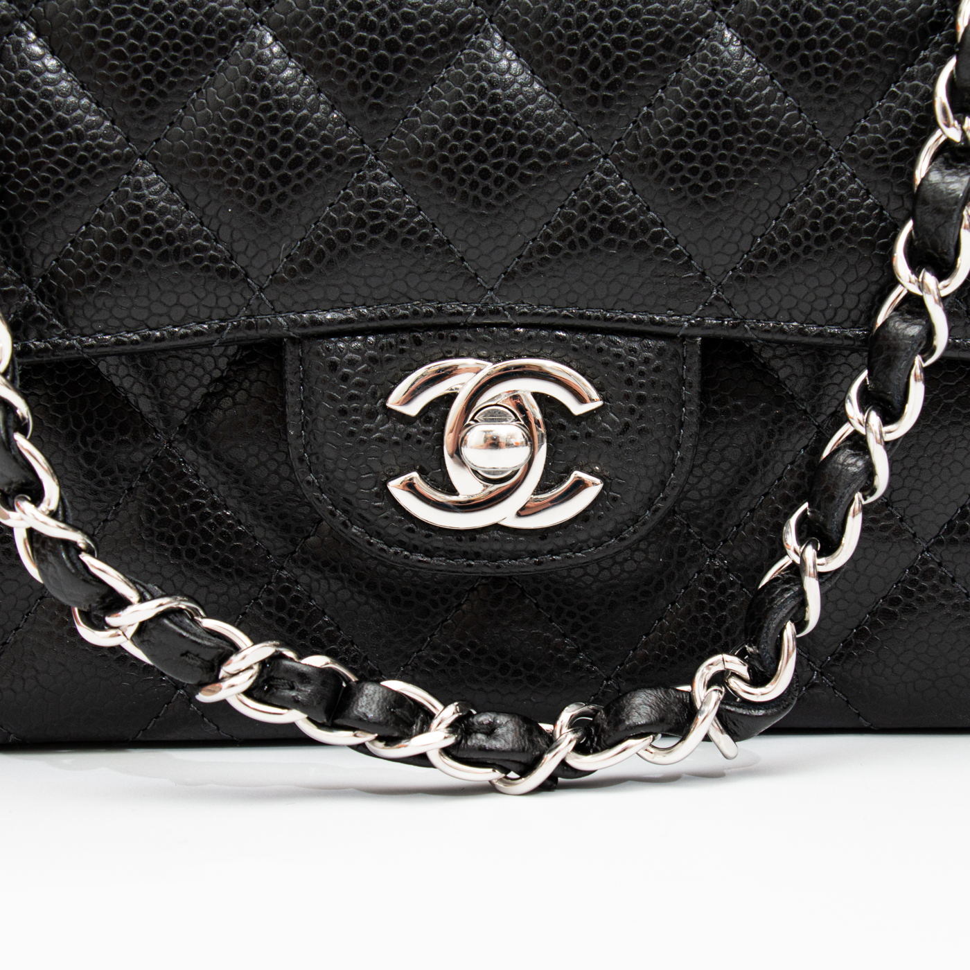Gefertigt aus robustem Caviar-Leder mit durchgezogenem Kettenriemen lässt sich die Tasche elegant über der Schulter tragen.