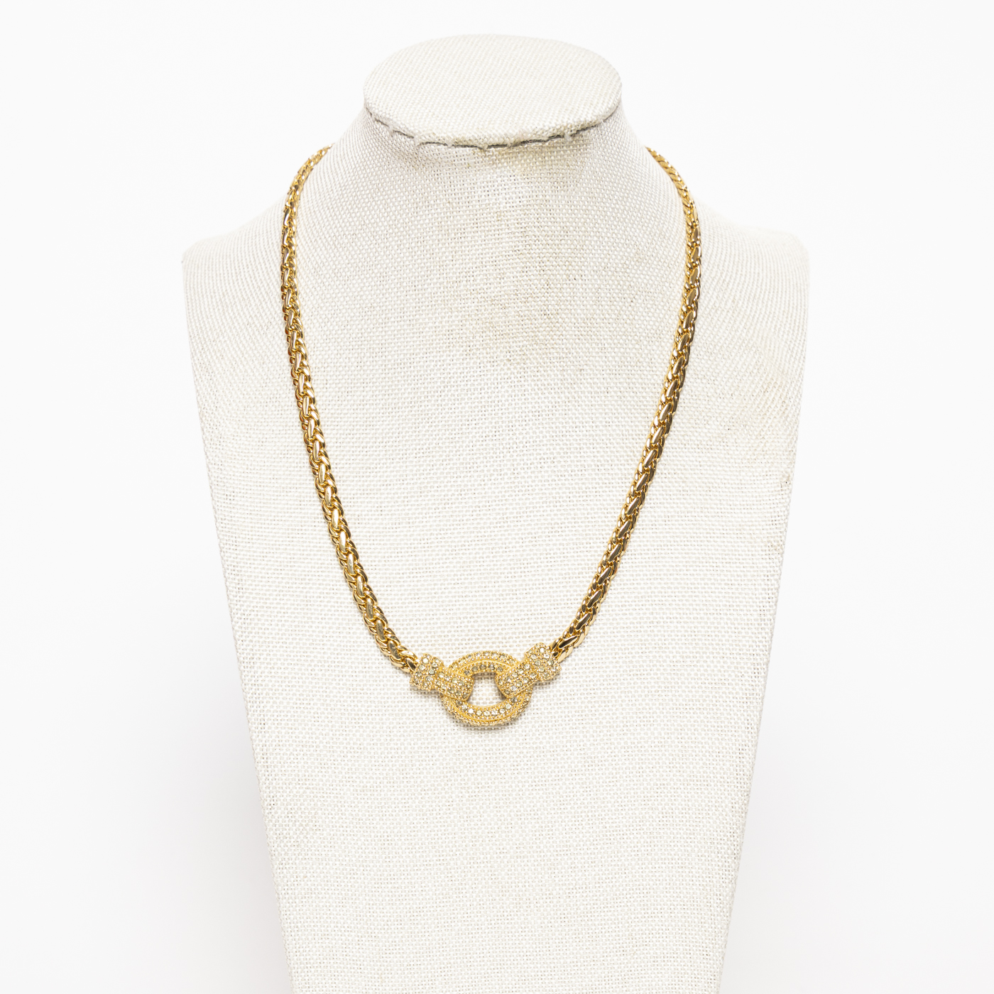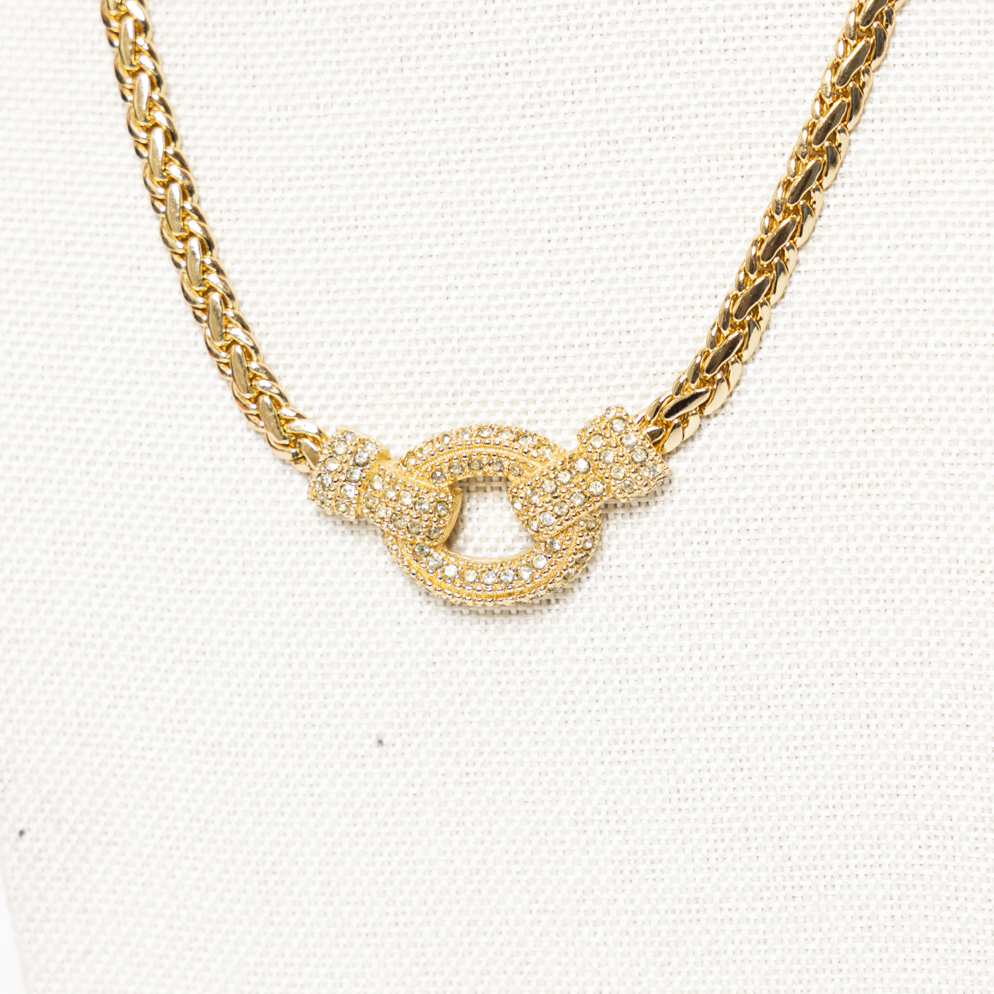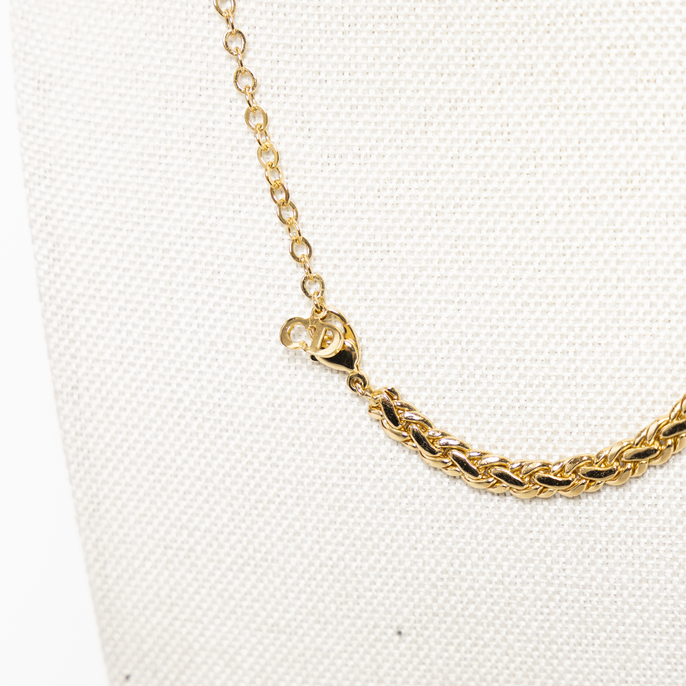 Diese Vintage Christian Dior Halskette beeindruckt mit ihrem markanten, zugleich eleganten Design. Die goldfarbene Kette mit geflochtener Struktur wird durch ein funkelndes, mit Kristallen besetztes Glied in der Mitte akzentuiert, das der Kette luxuriösen Glanz verleiht.