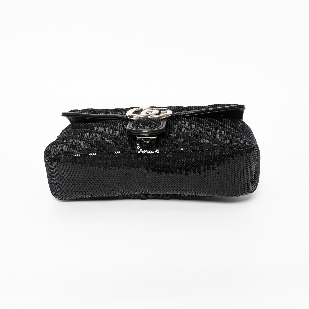 Die Gucci Marmont Tasche in Schwarz verleiht jedem Look einen Hauch von Glamour. Das Modell ist mit funkelnden Pailletten besetzt und wird durch die markante GG-Schnalle in silberfarbener Hardware abgerundet – ein ikonisches Detail der Linie.