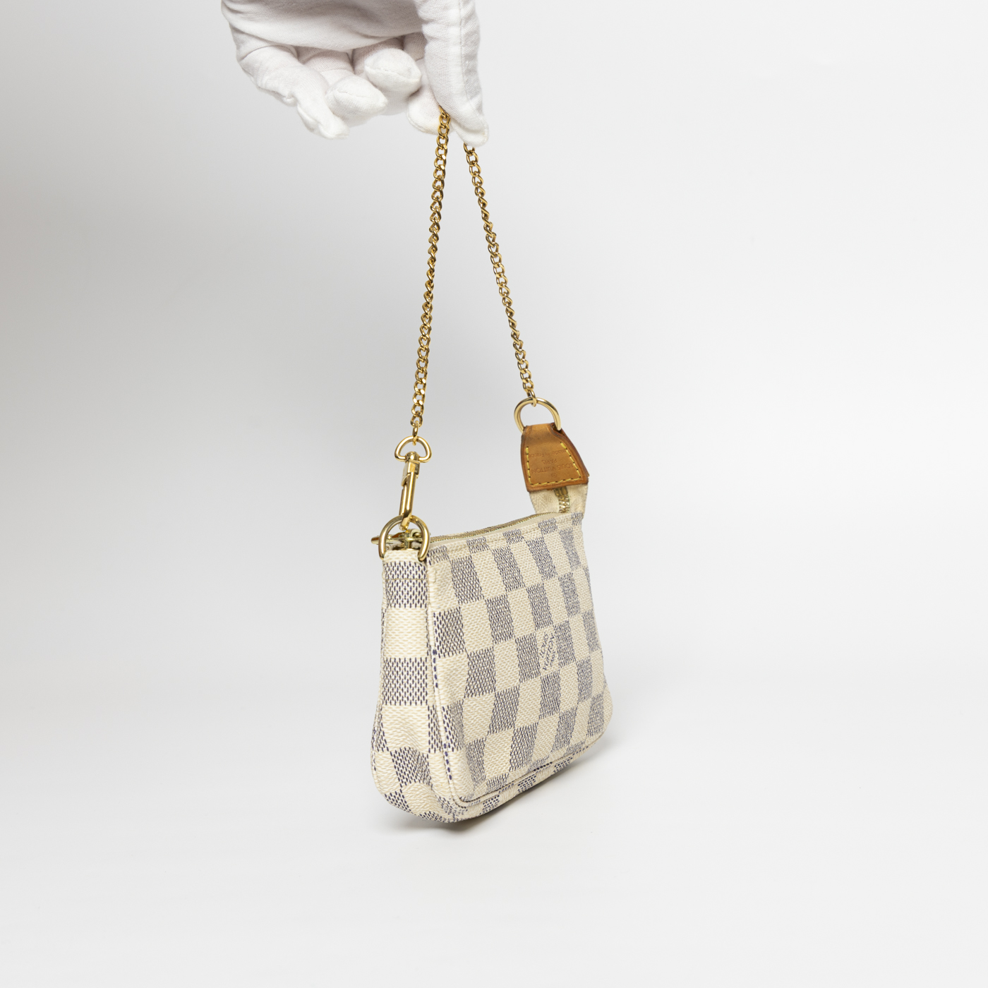 Die Louis Vuitton Mini Pochette Accessoires im ikonischen Damier Azur Canvas begeistert mit ihrem hellen, sommerlichen Design und feinen Besätzen aus naturbelassenem Rindsleder. Die goldfarbene Hardware setzt elegante Akzente und verleiht der kleinen Tasche einen luxuriösen Touch.